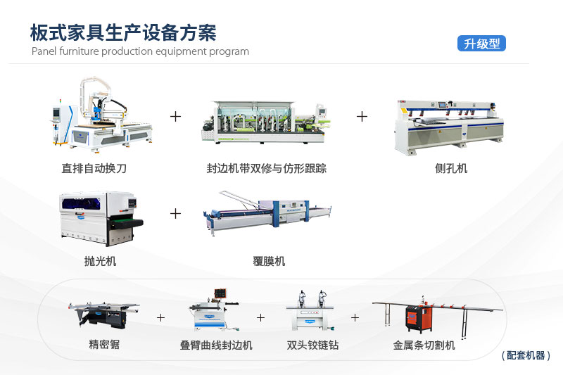 ?升級型-板式家具生產設備方案柜體/柜門(吸塑/平板)生產解決方案主要由直排換刀加工中心、封邊機、側孔機、拋光機、覆膜機、精密鋸、疊臂封邊機、雙主軸鉸鏈鉆、金屬條切割機組成,可滿足全屋定制廠家的生產加工,機器